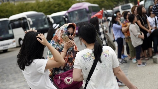 Du khách Trung Quốc đứng chờ xe bus. Ảnh: AFP