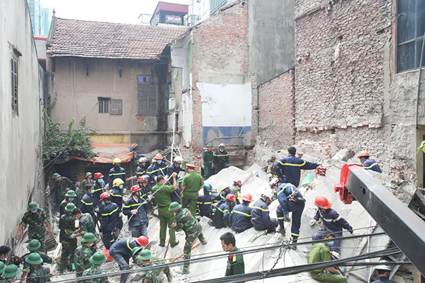 Khoảng 3h30 sáng nay, ngôi nhà 3 tầng một tum số 43 Cửa Bắc (phường Trúc Bạch, Ba Đình, Hà Nội) bất ngờ đổ sập hoàn toàn, vùi lấp nhiều người phía dưới. Đây là cơ sở kinh doanh nem Xuân Dần, diện tích mặt sàn hơn 30 m2, trong đó tầng 1-2 để kinh doanh, tầng 3 là nơi ngủ của nhân viên và bếp ăn.