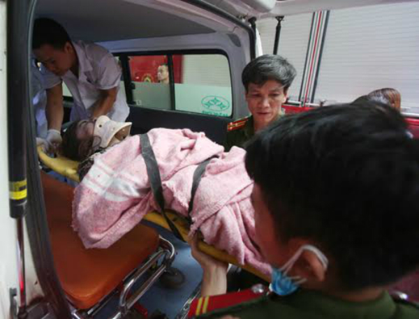 Một nạn nhân nữ được đưa ra bằng cáng và lên xe cứu thương đến thẳng Bệnh viện Việt Đức. Lộ rõ vẻ hốt hoảng, nạn nhân cho biết bị thương ở chân, đau ở bụng.