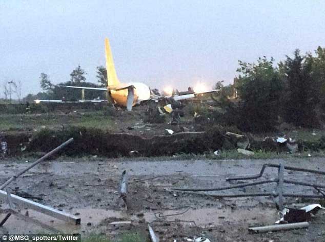 Hình ảnh từ hiện trường cho thấy, mũi của chiếc Boeing lao xuyên qua rào chắn của sân bay và cảnh tàn phá sau khi máy bay trượt khỏi đường băng.