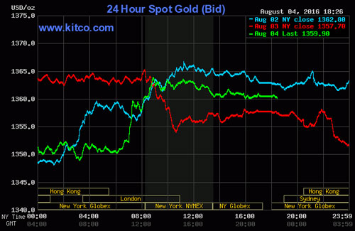 Tính tới 5h30 sáng 5/8 (giờ Việt Nam), giá vàng giao ngay trên thị trường châu Á giảm 0,3 USD xuống 1.360,1 USD/ounce sau khi tăng 10 USD trên sàn NY, thậm chí có lúc tăng 15 USD trên thị trường châu Âu. Giá vàng giao tháng 12 chốt phiên giao dịch đêm qua trên thị trường giao dịch hàng hóa Mỹ Comex tăng 3,1 USD lên 1.367,7 USD/ounce.