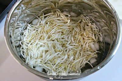 Tiếp đến chuyển giá đỗ ra thau nước đá để đảm bảo giá đỗ không bị chín quá.