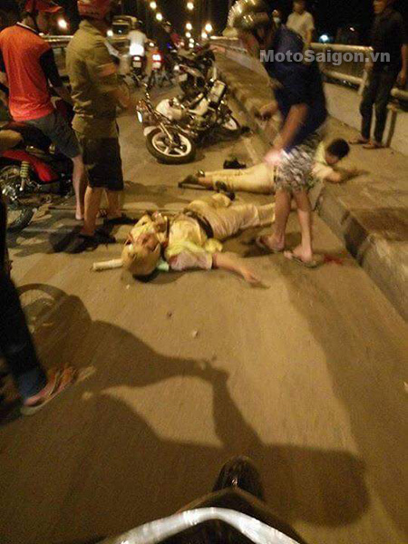 CSGT Hóc Môn gặp tai nạn nghiêm trọng khi đang truy đuổi nhóm quái xế đua xe… thì bị 1 tên ngồi sau xe chèn ép và dùng chân đạp vào đầu xe, khiến 2 CSGT Hóc Môn loạng choạng và té bất tỉnh… theo lời miêu tả của 1 người dân tại hiện trường thì… tai nạn xảy ra vào lúc 9 giờ tối ngày 10/8/2016 Cầu Rạch Tra, nối H.Hóc Môn với H.Củ Chi, TP.HCM.