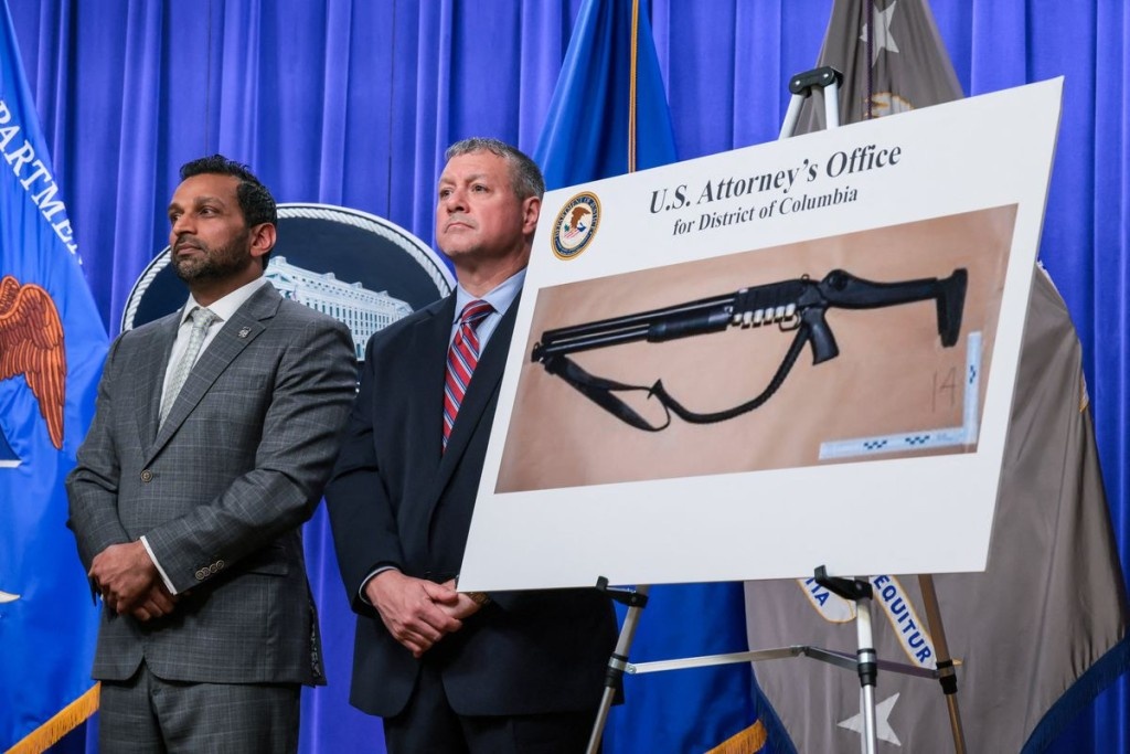 Giám đốc Cục Điều tra Liên bang Mỹ (FBI) Kash Patel và viên phụ tá giám đốc phụ trách văn phòng FBI Washington Darren Cox đứng bên cạnh bức ảnh khẩu súng săn mà nghi phạm Cole Tomas Allen mang theo. (Ảnh: Reuters)