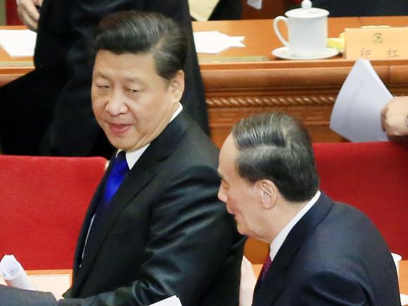 Chủ tịch Trung Quốc Tập Cận Bình trao đổi với ông Vương Kỳ Sơn - người đứng đầu Ủy ban Kiểm tra Kỷ luật Trung ương Đảng Cộng sản Trung Quốc sau lễ khai mạc cuộc họp thường niên của Hội nghị Hiệp thương chính trị Nhân dân Trung Quốc gọi tắt là Chính hiệp ngày 3.3.