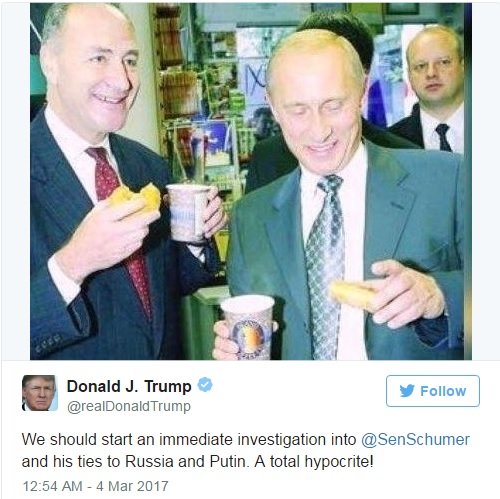 Ông Trump viết: “Chúng ta cần tiến hành ngay cuộc điều tra về mối quan hệ của Thượng nghị sĩ Schumer với Nga và Putin. Thật là đạo đức giả!”.