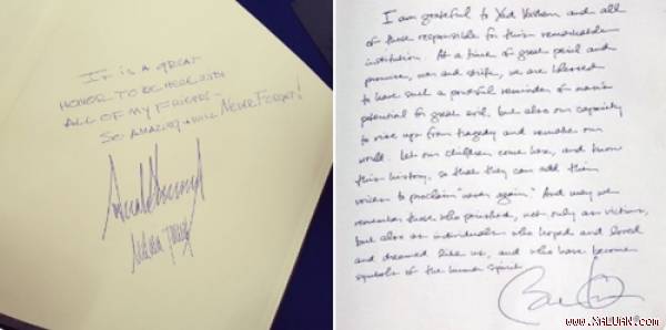 Trong khi ông Trump để lại lời đề tặng rất ngắn gọn trên sổ lưu niệm tại bảo tàng ở Israel thì người tiền nhiệm Obama lại để lại những dòng văn phong trau chuốt.