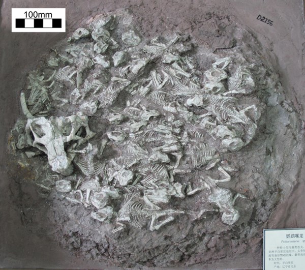 Hộp sọ của con khủng long lớn hơn nằm cùng một chỗ với 24 con khủng long non. Thậm chí, hai trong số các con non còn đan lẫn với hộp sọ này, cho thấy các con vật đã ở cạnh nhau khi chúng chết.